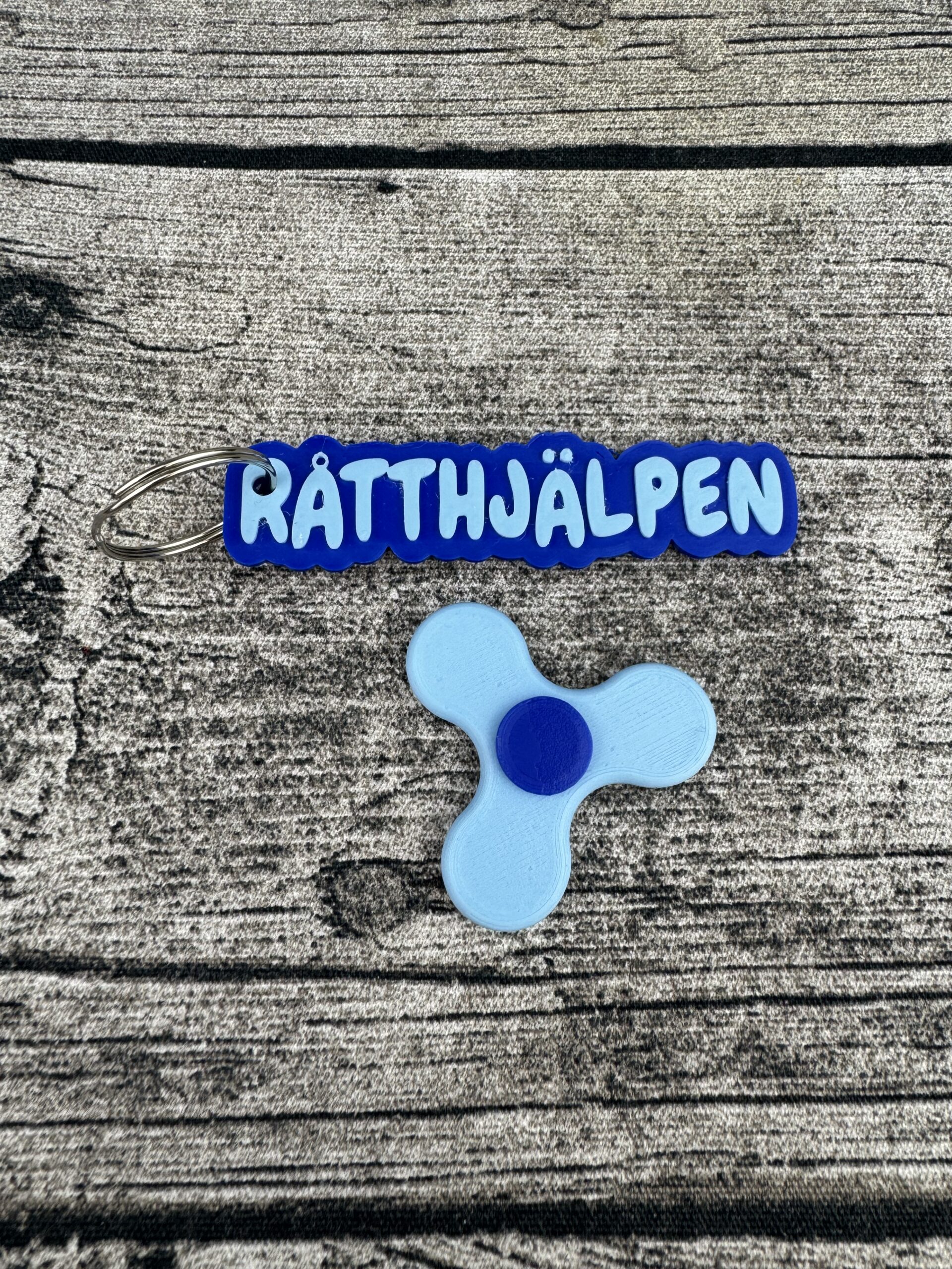 En 3D printad råtthjälpen nyckelring och en matchande fidgetspinner.