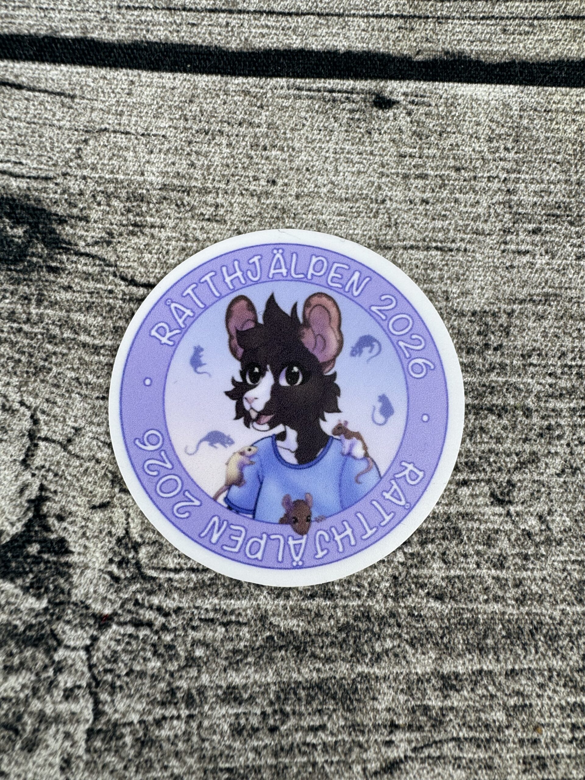 Råtthjälpens egna NordicFuzzCon klistermärke, som gjordes inför att Råtthjälpen blev valda som årets charity 2026.